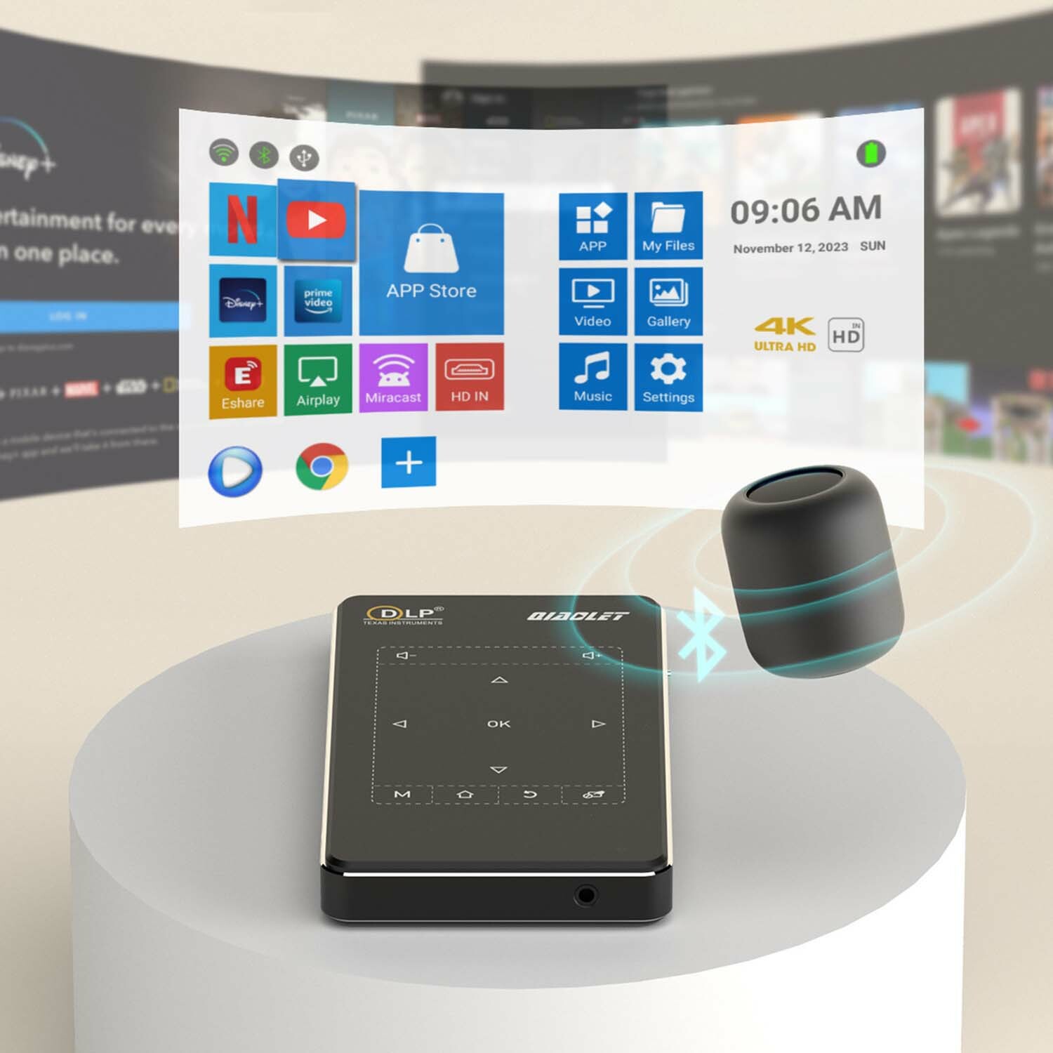 — BLUETOOTH 4. I / WIFI2.4G/5G AC The projector connects Bluetooth speaker to play music through Bluetooth. The projector using 2.4G /5G AC WIFI with stable transmission without stutter, effectively avoid signal interference. Play 4K HD movies fluently.