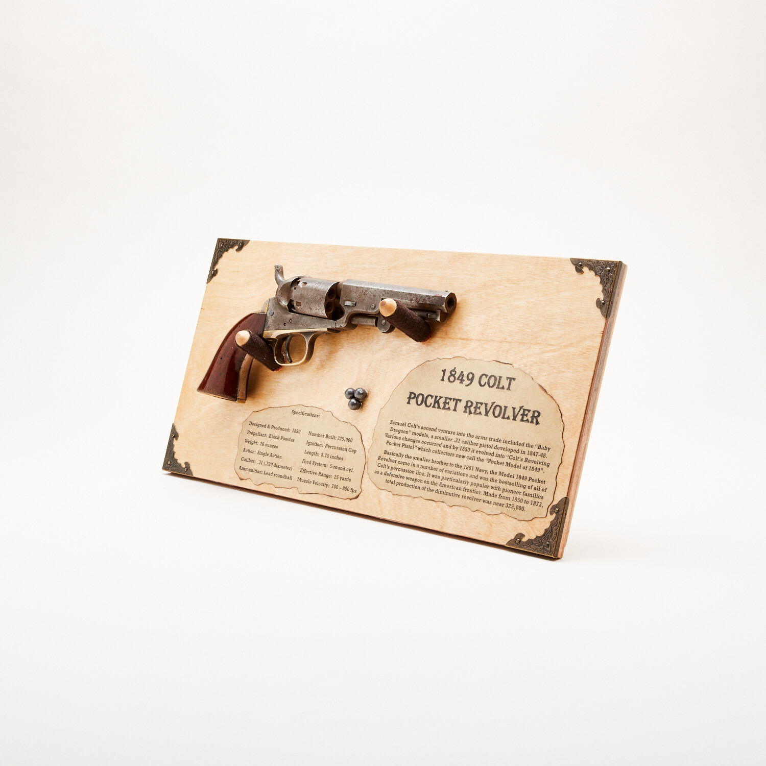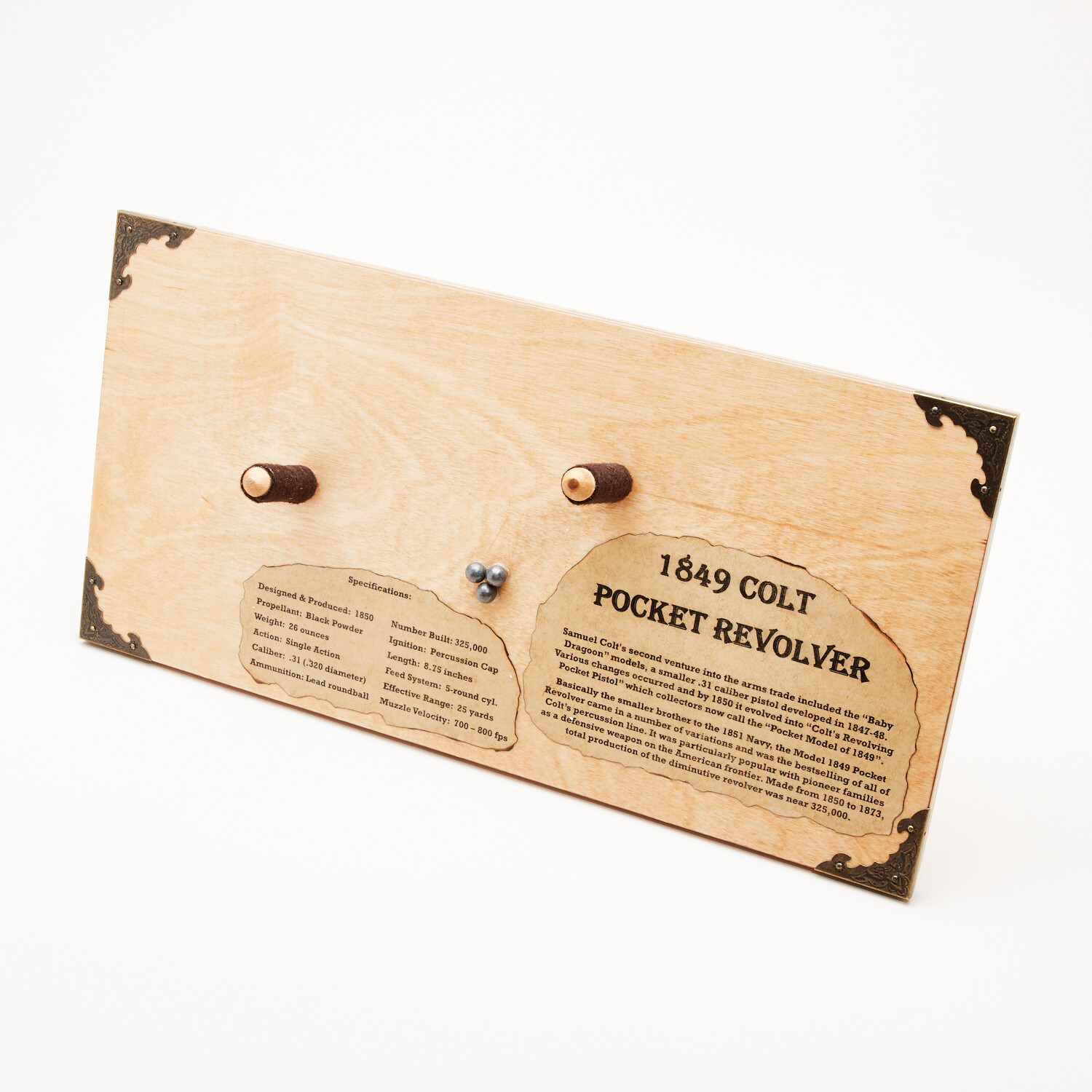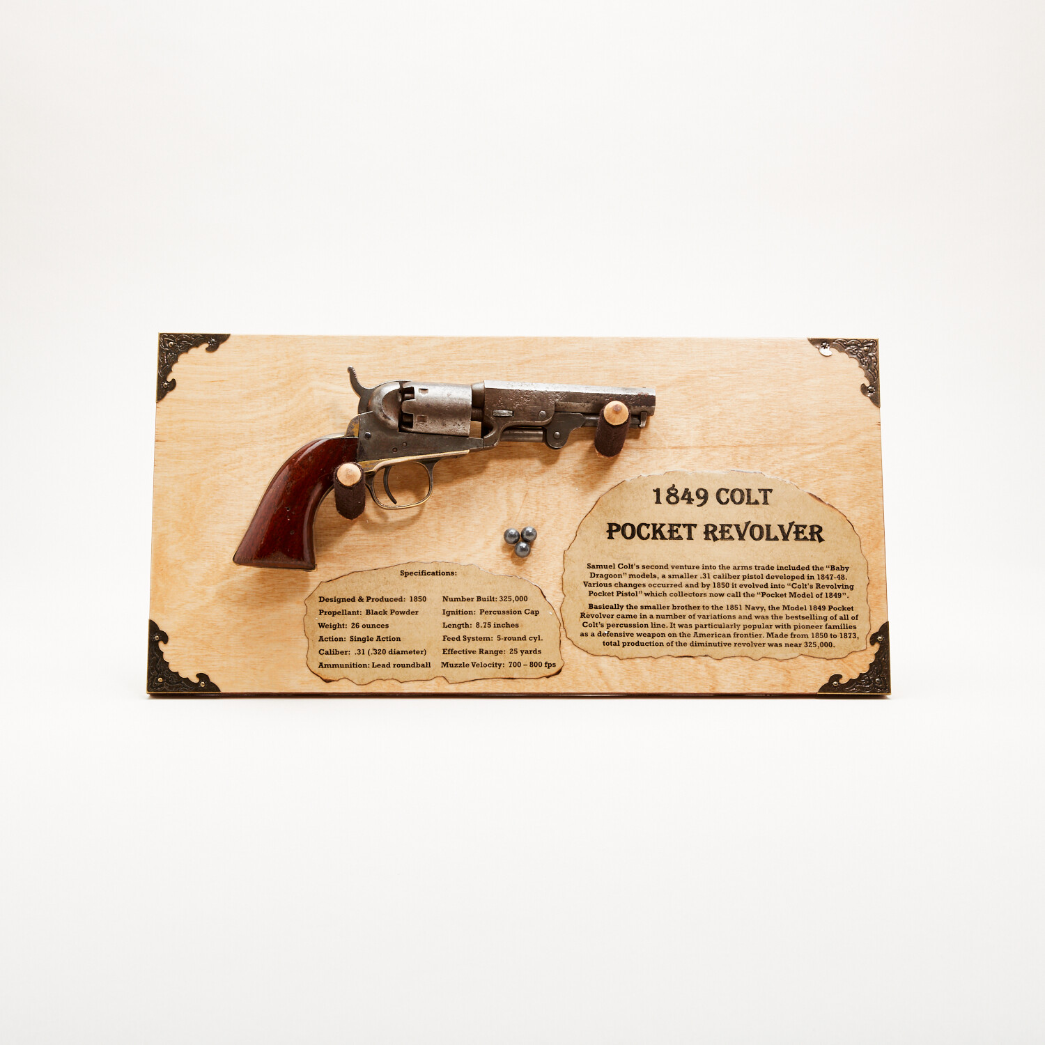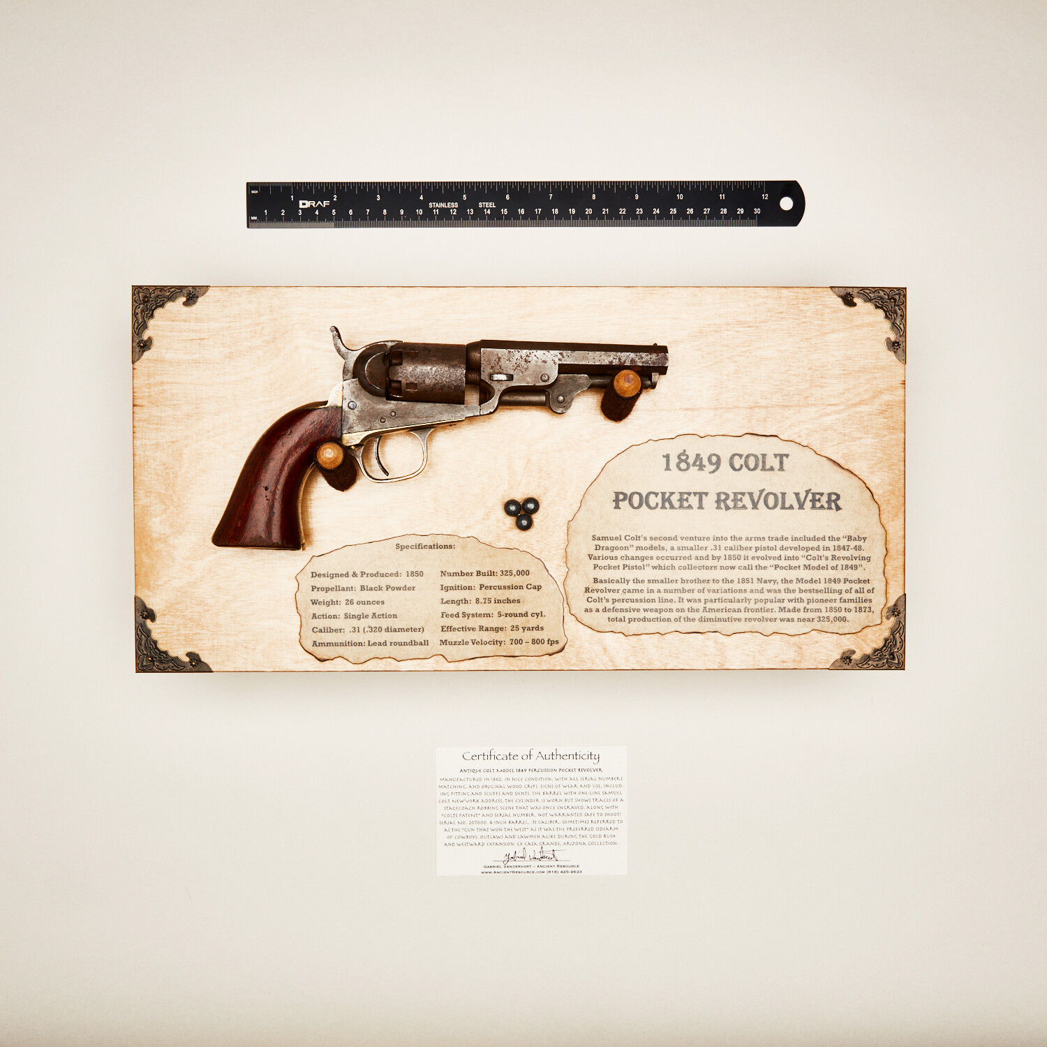This .31 caliber pistol is mount on a custom freestanding wood display including a trio of period lead shot. This is a fantastic display piece with a ton of history and eye appeal. An excellent addition to any collection!