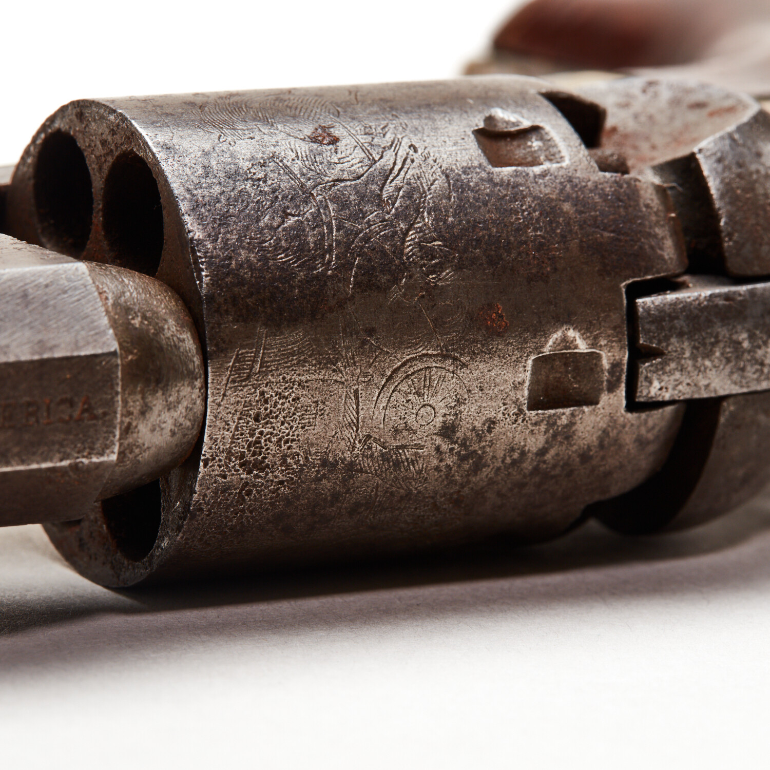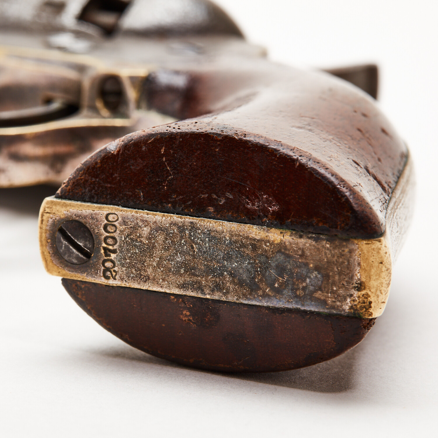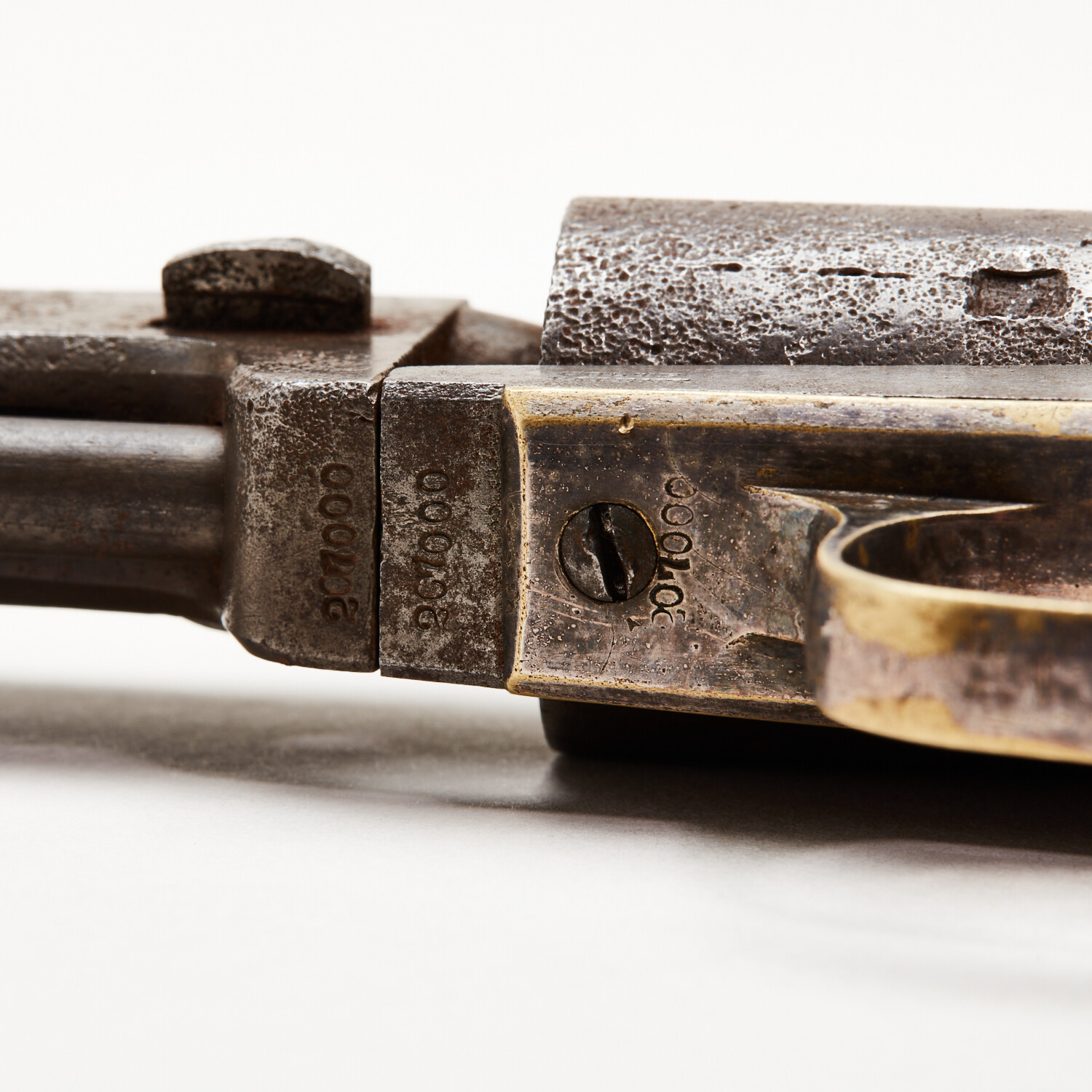 The Colt model 1849 is sometimes referred-to as “the Gun that Won the West” as it was the preferred sidearm of cowboys, outlaws, and lawmen alike during the Gold Rush and Westward Expansion. The barrel has the one-line Samuel Colt New York address “ADDRESS CCL SAM’L COLT NEW YORK U.S. AMERICA.” The cylinder is worn but still shows traces of a stagecoach robbing scene that was once engraved on it, along with “COLTS PATENT” and serial number. It cycles properly, however this is an antique and not warranted safe to shoot and it should not be attempted without the aid of an expert.