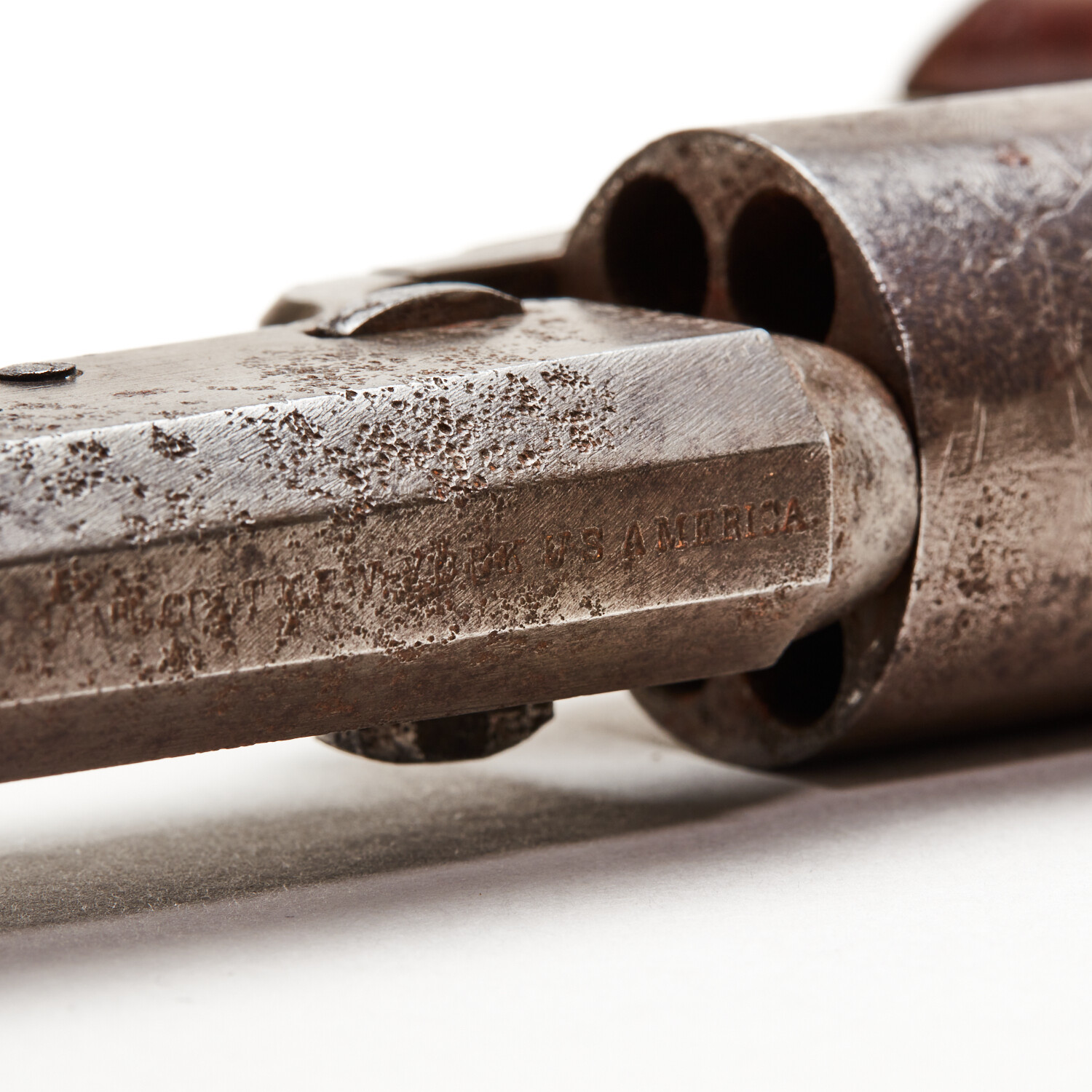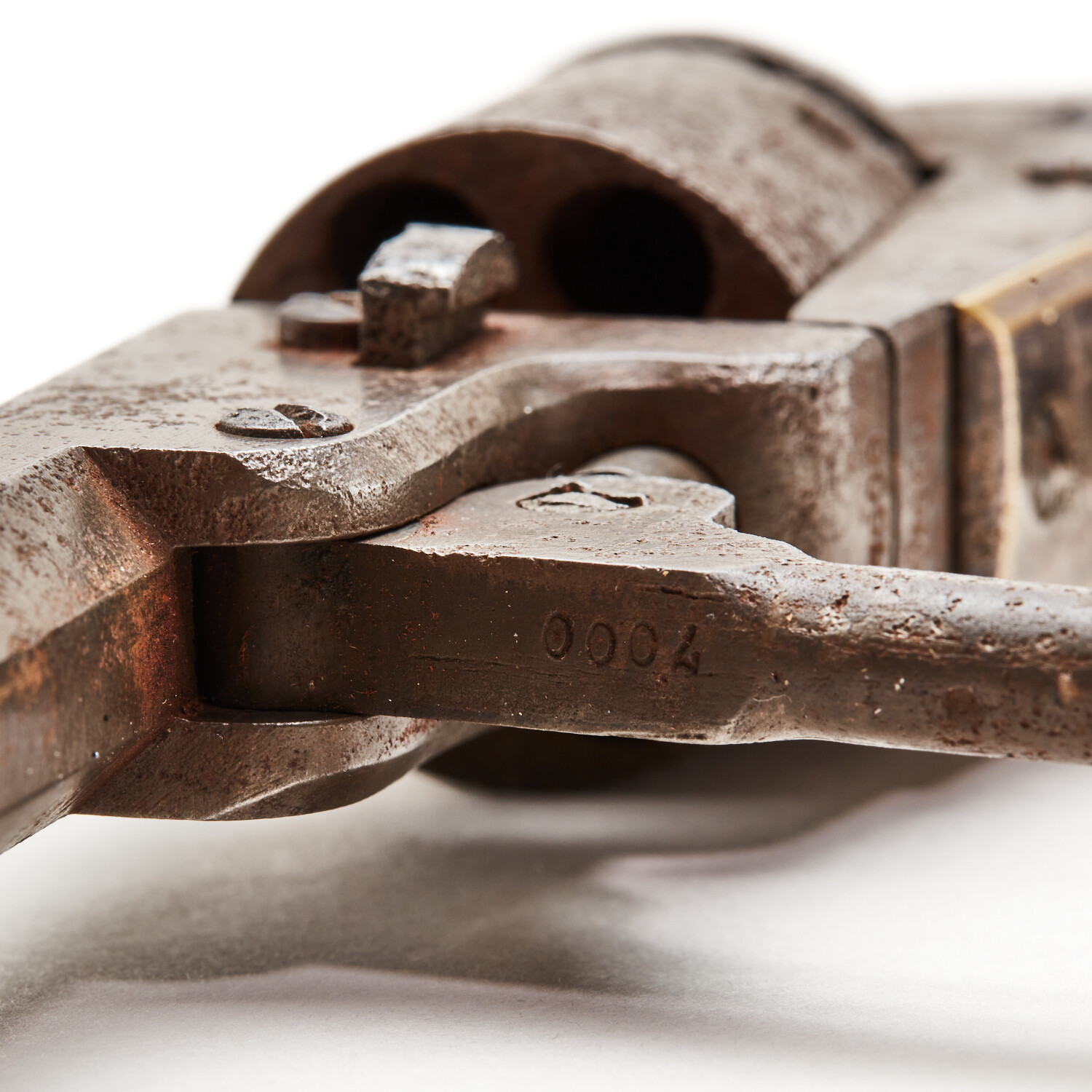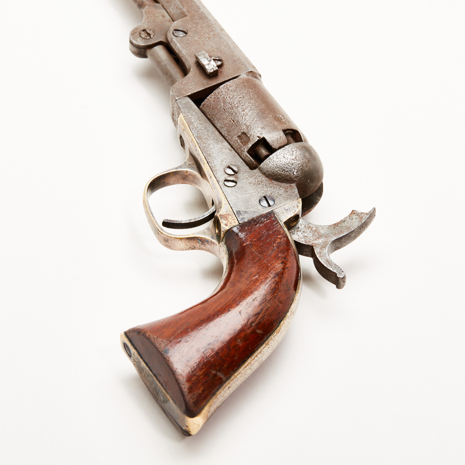The Colt model 1849 is sometimes referred-to as “the Gun that Won the West” as it was the preferred sidearm of cowboys, outlaws, and lawmen alike during the Gold Rush and Westward Expansion. The barrel has the one-line Samuel Colt New York address “ADDRESS CCL SAM’L COLT NEW YORK U.S. AMERICA.” The cylinder is worn but still shows traces of a stagecoach robbing scene that was once engraved on it, along with “COLTS PATENT” and serial number. It cycles properly, however this is an antique and not warranted safe to shoot and it should not be attempted without the aid of an expert.