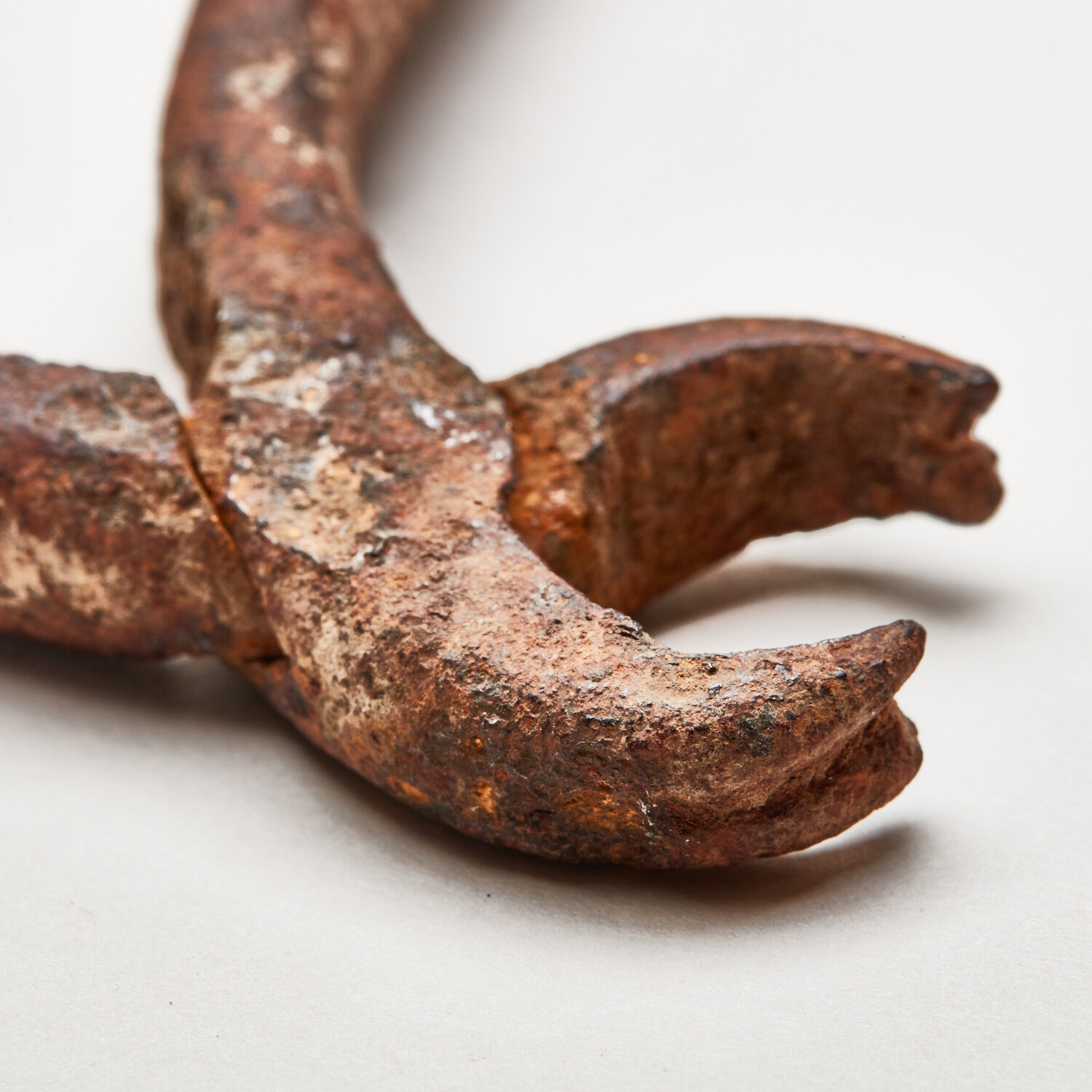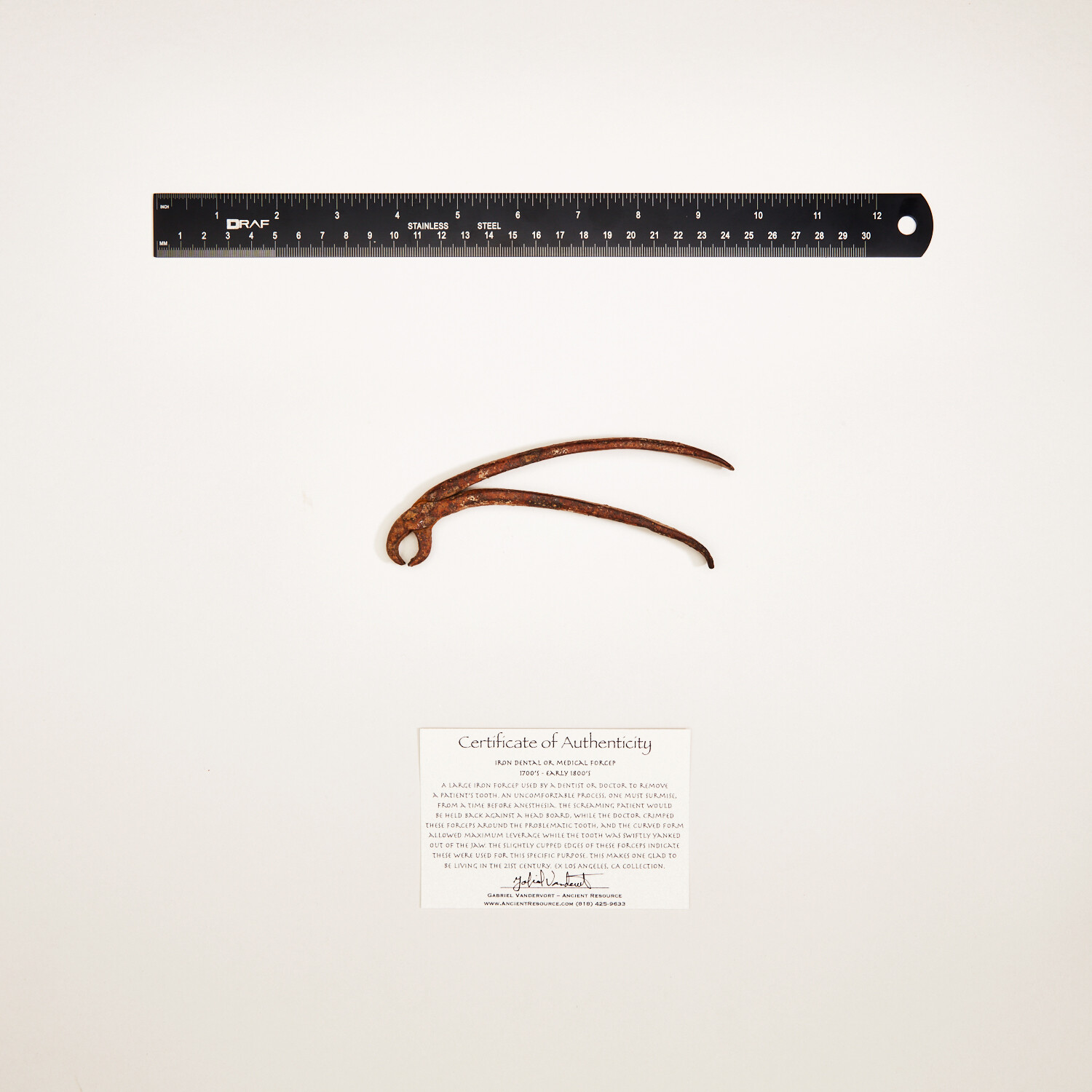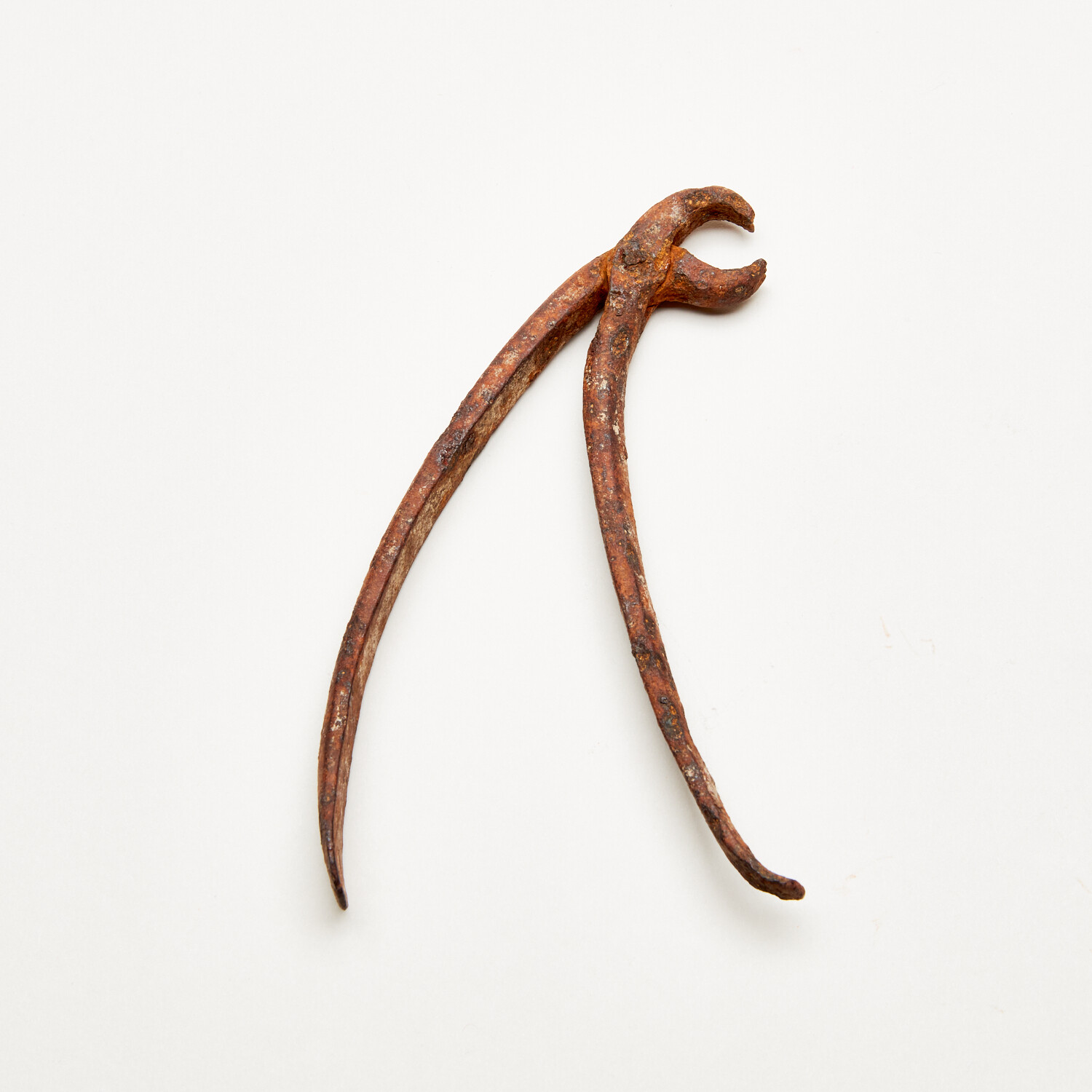 A large iron forcep dating from the 1700s to early 1800s used by a dentist or doctor to remove a patient’s tooth. An uncomfortable process from a time before anesthesia. The screaming patient would be held back against a head board, while the doctor crimped these forceps around the problematic tooth, and the curved form allowed maximum leverage while the tooth was swiftly yanked out of the jaw. The slightly cupped edges of these forceps indicate these were used for this specific purpose. This makes one glad to be living in the 21st century.
