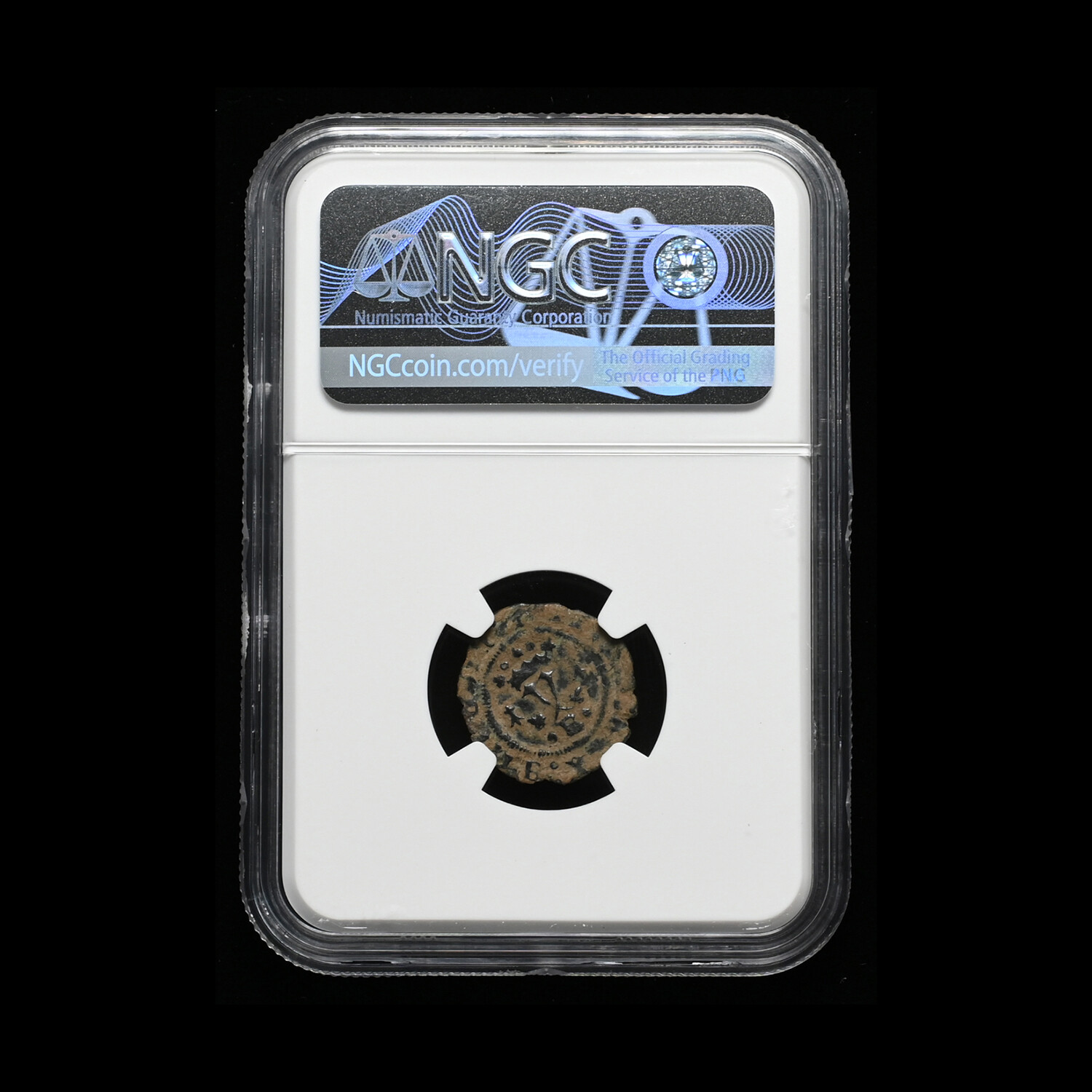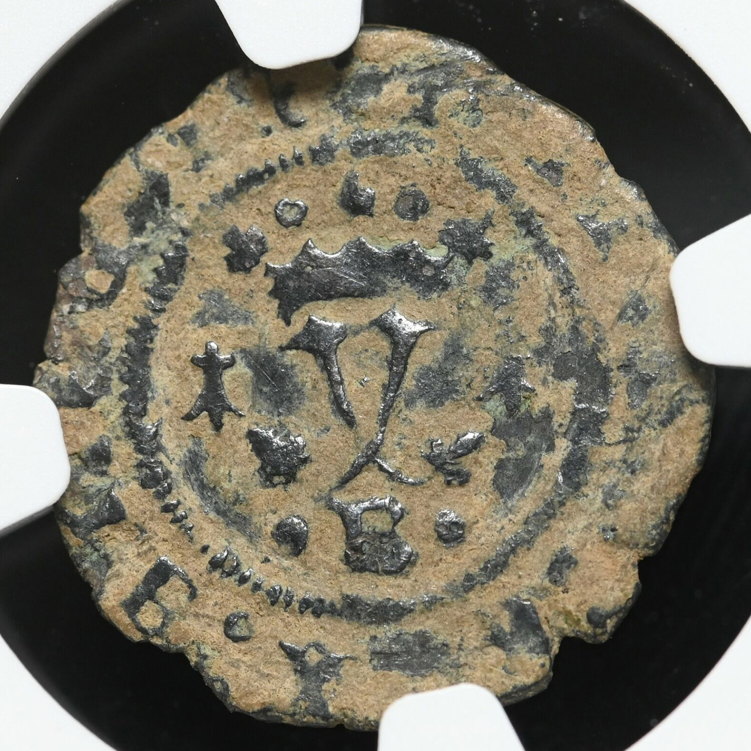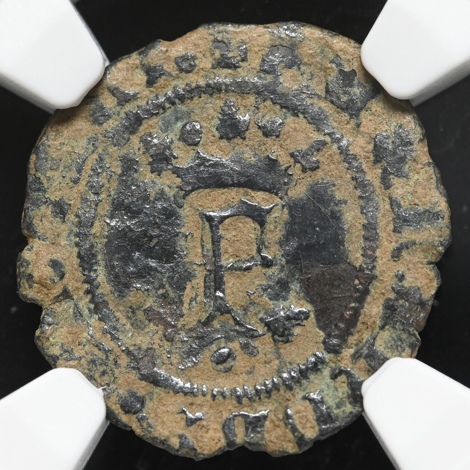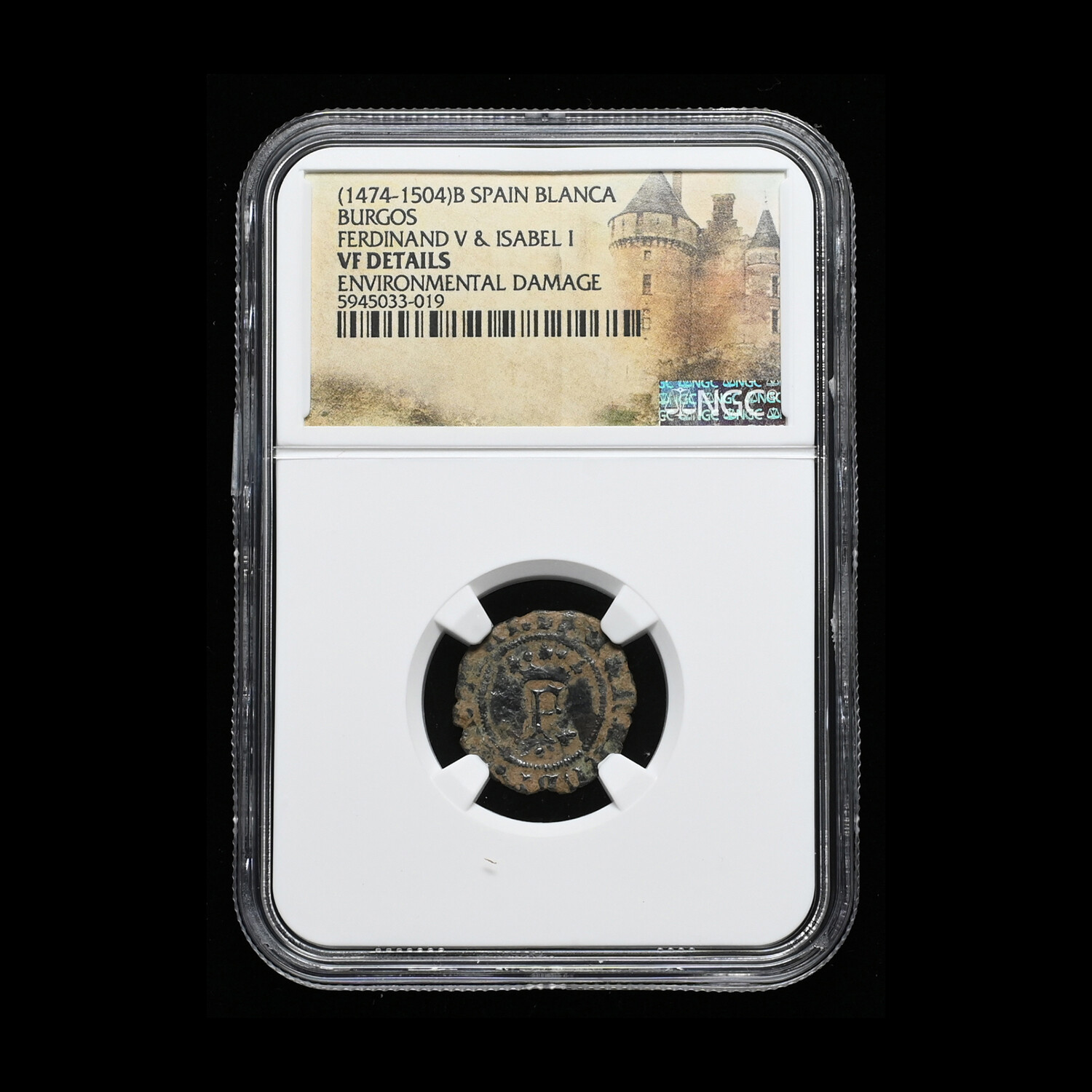 Late Medieval Spain. Ferdinand II and Isabella, 1469-1504 AD. Bronze Blanca. Crowned F, FERNANDVS ET ELISABET around / Crowned Y, REX ET REGINA CAST LEGION around. Olive-green patina with earthen highlights. Encapsulated and graded Very Fine Details by NGC.