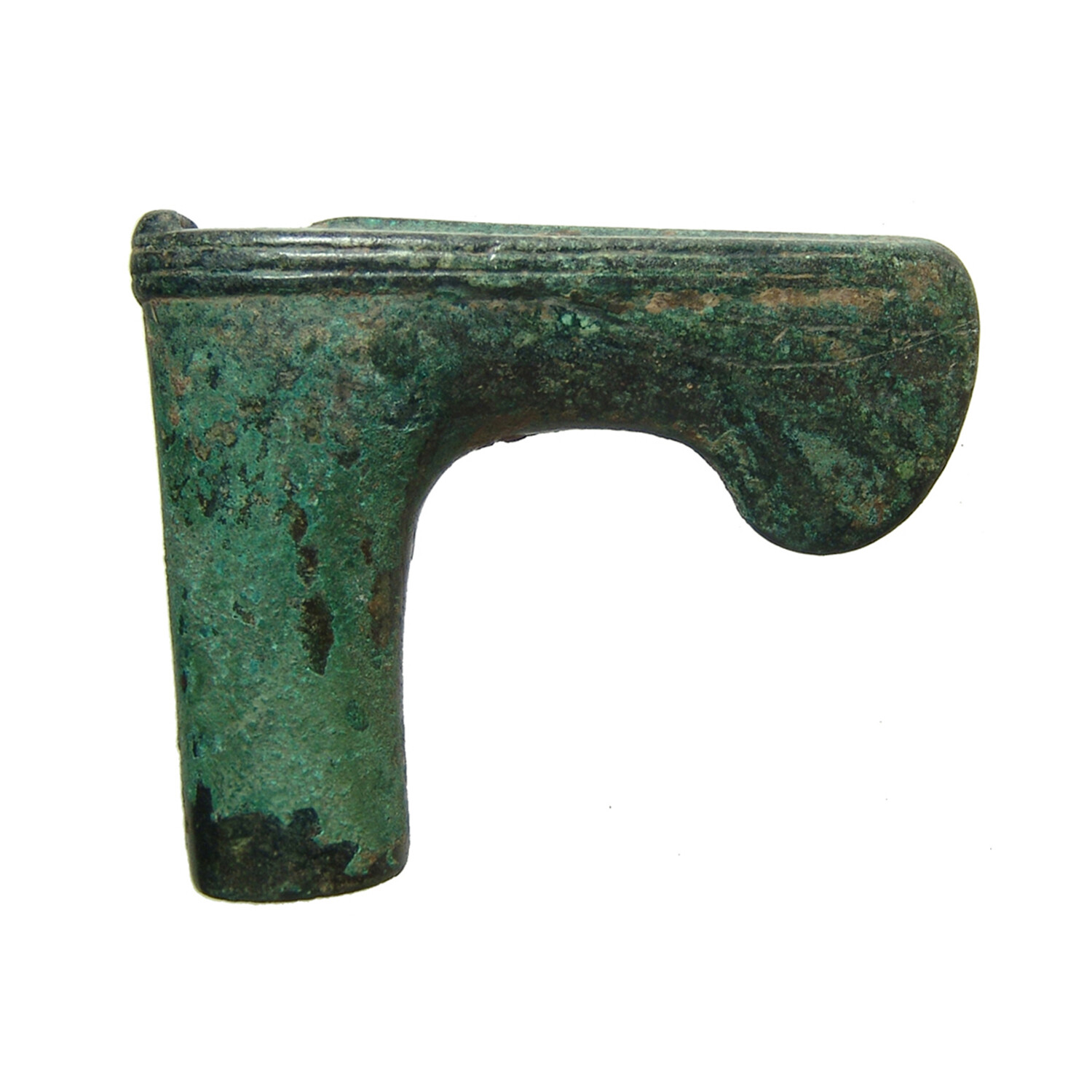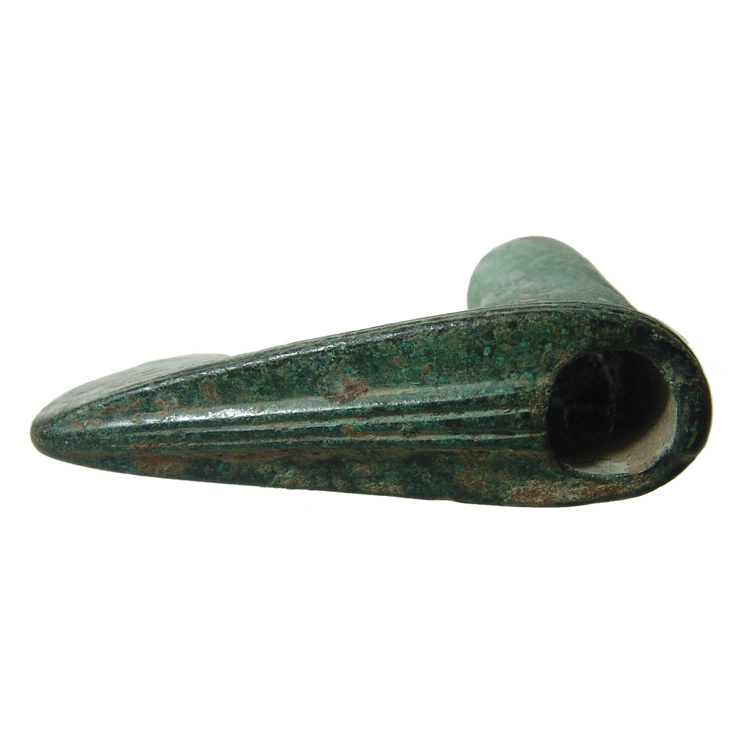 Luristan, ancient Persia, c. 1000 - 800 BC. Excellent bronze battle axe head, with narrow shaft hole and rounded cutting edge. Ribbed bands adorn the upper edge with a central band along the top. Nicely patinated.