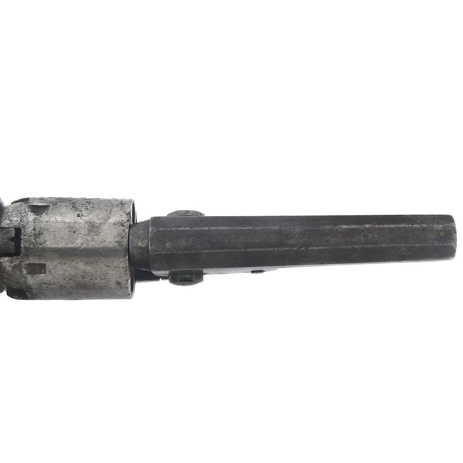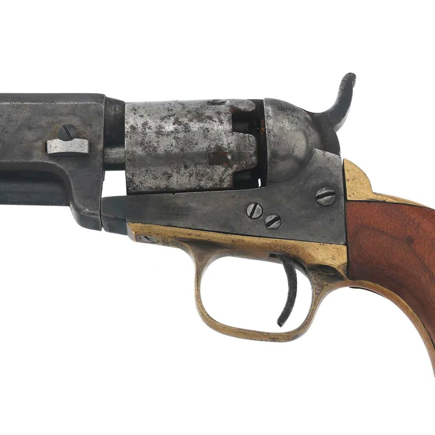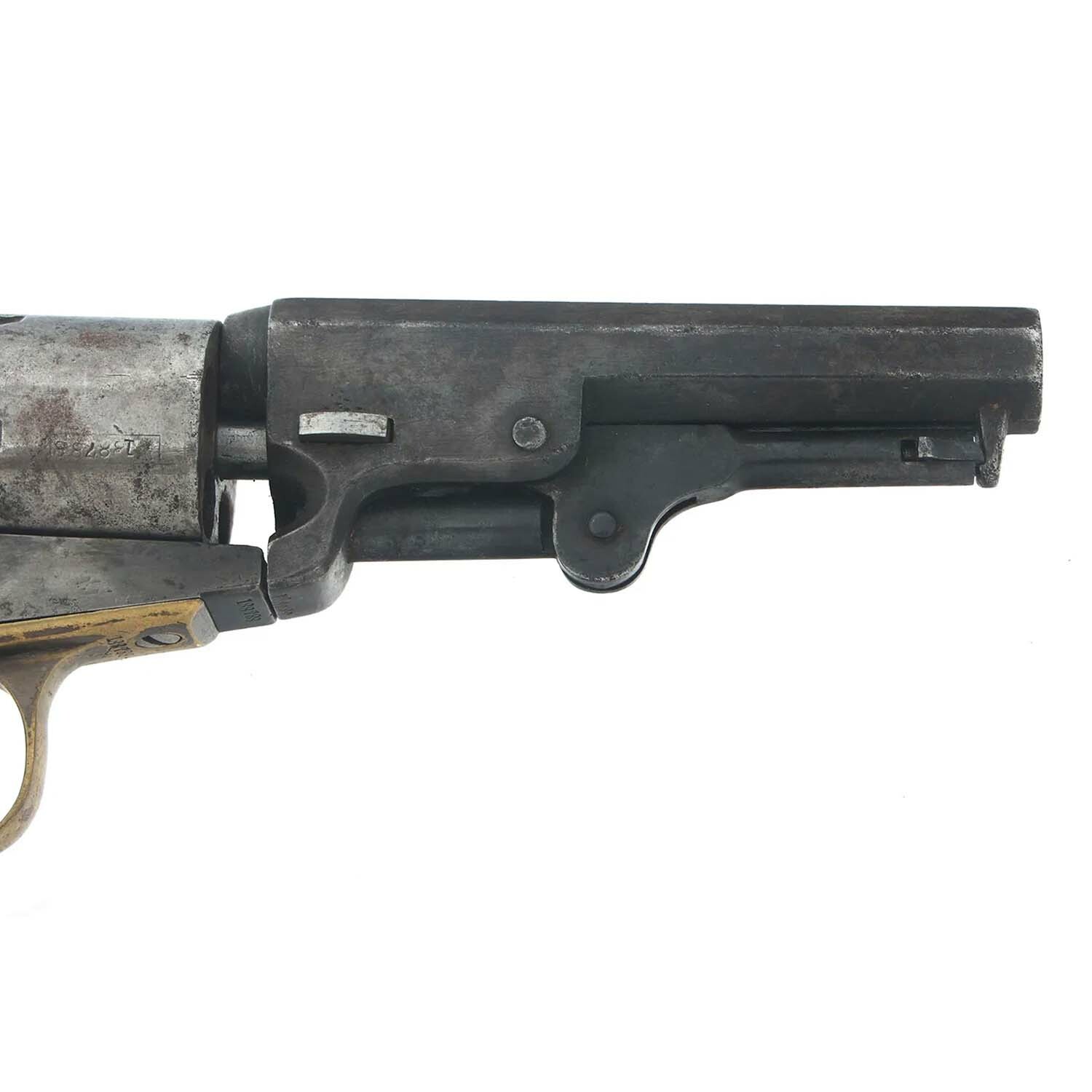 Antique Colt Model 1849 Percussion Pocket Revolver, manufactured in 1861, undoubtedly seeing active use during the Civil War. In good condition for its age, with all serial numbers 188788 correctly matching. With its original wood grips, a Five-shot smooth cylinder, and 0.31 caliber 4-inch barrel. Signs of wear and use overall, including some scuffs, dents and rust typical for a pistol of this age. The barrel has the one-line Samuel Colt New York address “ADDRESS COL SAM’L COLT NEW YORK U.S. AMERICA”. Mechanically good and extremely well preserved! Ex Tallahassee, FL collection. Total pistol length 9 inches. An excellent addition to any collection! Entire pistol length 9 inches. Ex Tallahassee, FL collection. **The Colt model 1849 is sometimes referred-to as “the Gun that Won the West” as it was the preferred sidearm of cowboys, outlaws and lawmen alike during the Gold Rush and Westward Expansion.