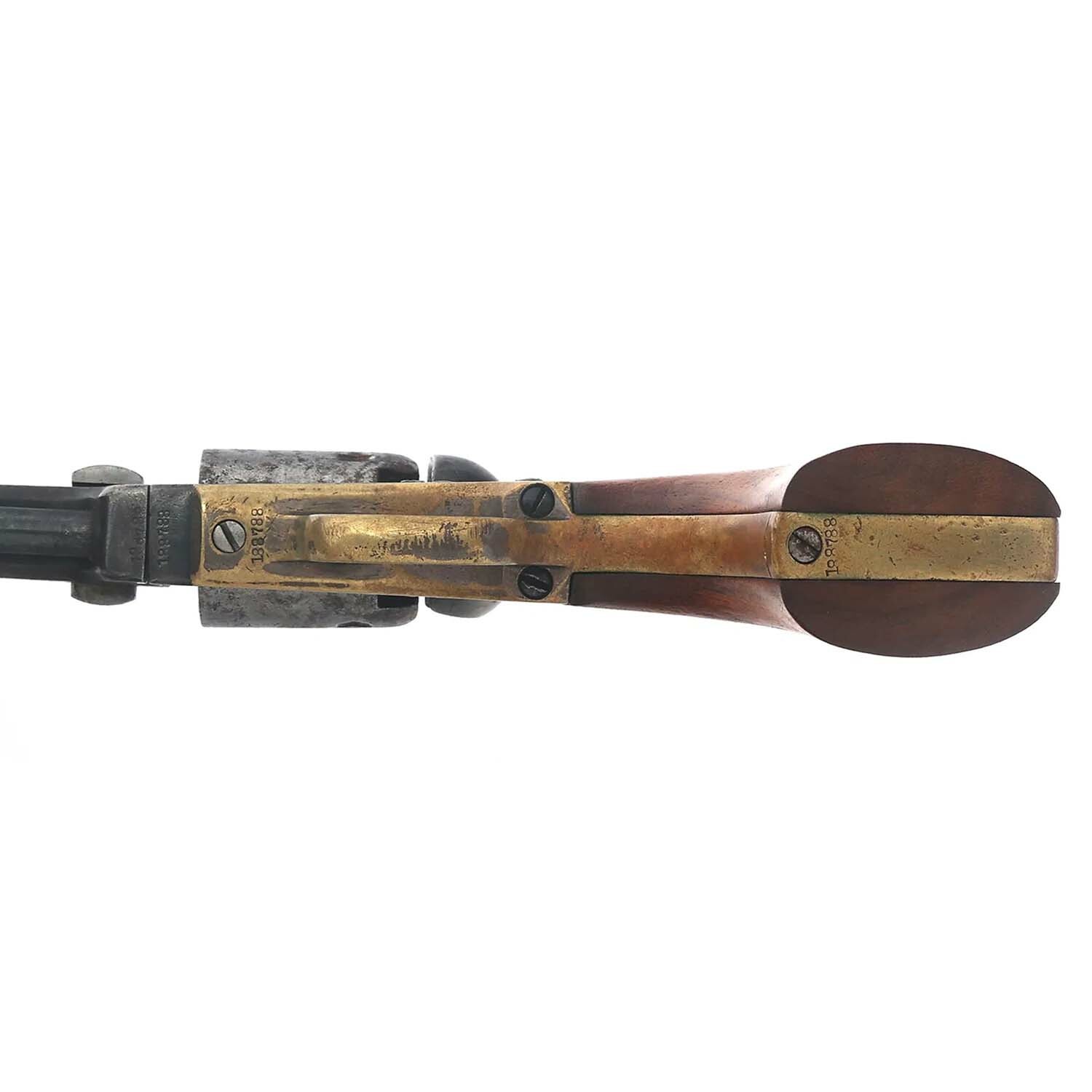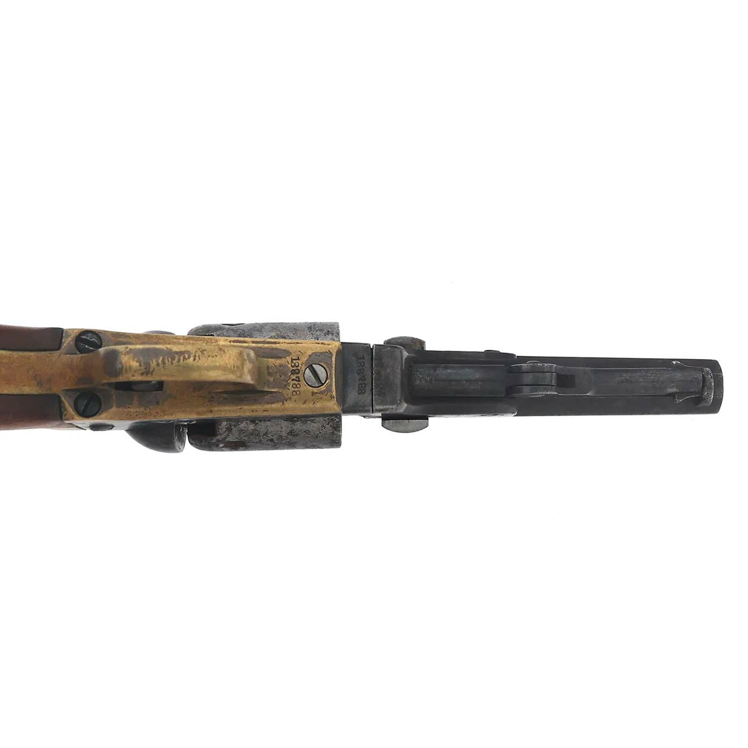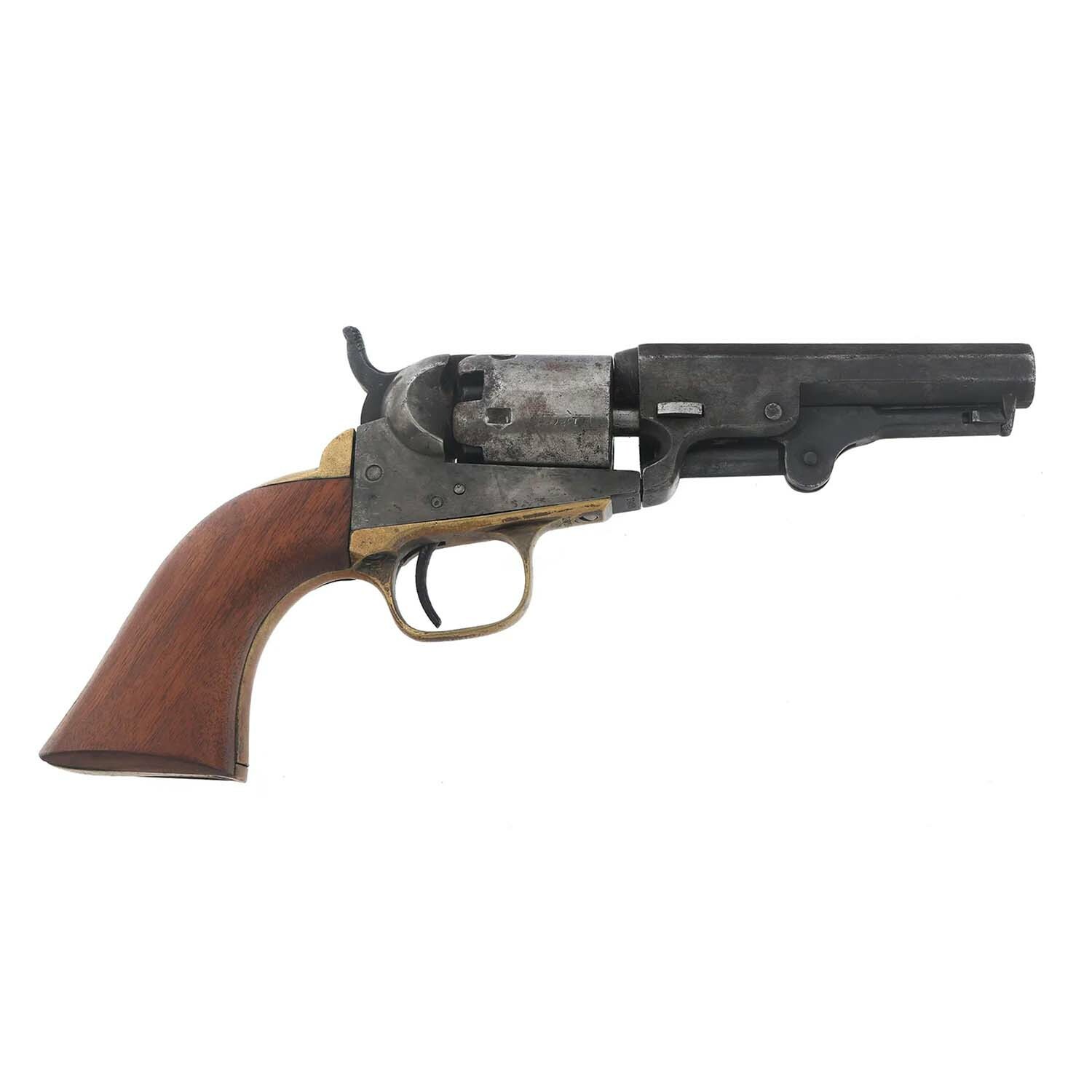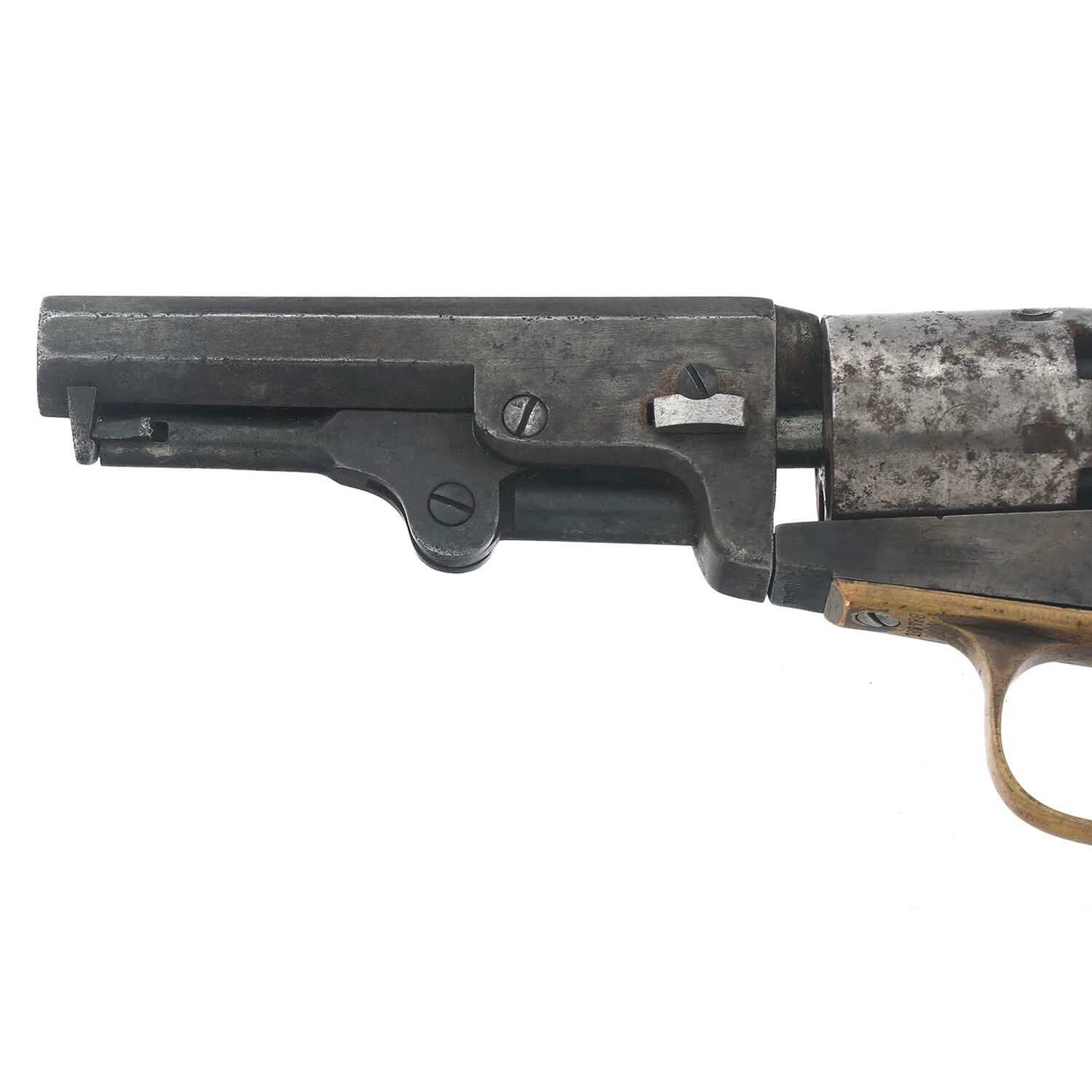 Antique Colt Model 1849 Percussion Pocket Revolver, manufactured in 1861, undoubtedly seeing active use during the Civil War. In good condition for its age, with all serial numbers 188788 correctly matching. With its original wood grips, a Five-shot smooth cylinder, and 0.31 caliber 4-inch barrel. Signs of wear and use overall, including some scuffs, dents and rust typical for a pistol of this age. The barrel has the one-line Samuel Colt New York address “ADDRESS COL SAM’L COLT NEW YORK U.S. AMERICA”. Mechanically good and extremely well preserved! Ex Tallahassee, FL collection. Total pistol length 9 inches. An excellent addition to any collection! Entire pistol length 9 inches. Ex Tallahassee, FL collection. **The Colt model 1849 is sometimes referred-to as “the Gun that Won the West” as it was the preferred sidearm of cowboys, outlaws and lawmen alike during the Gold Rush and Westward Expansion.