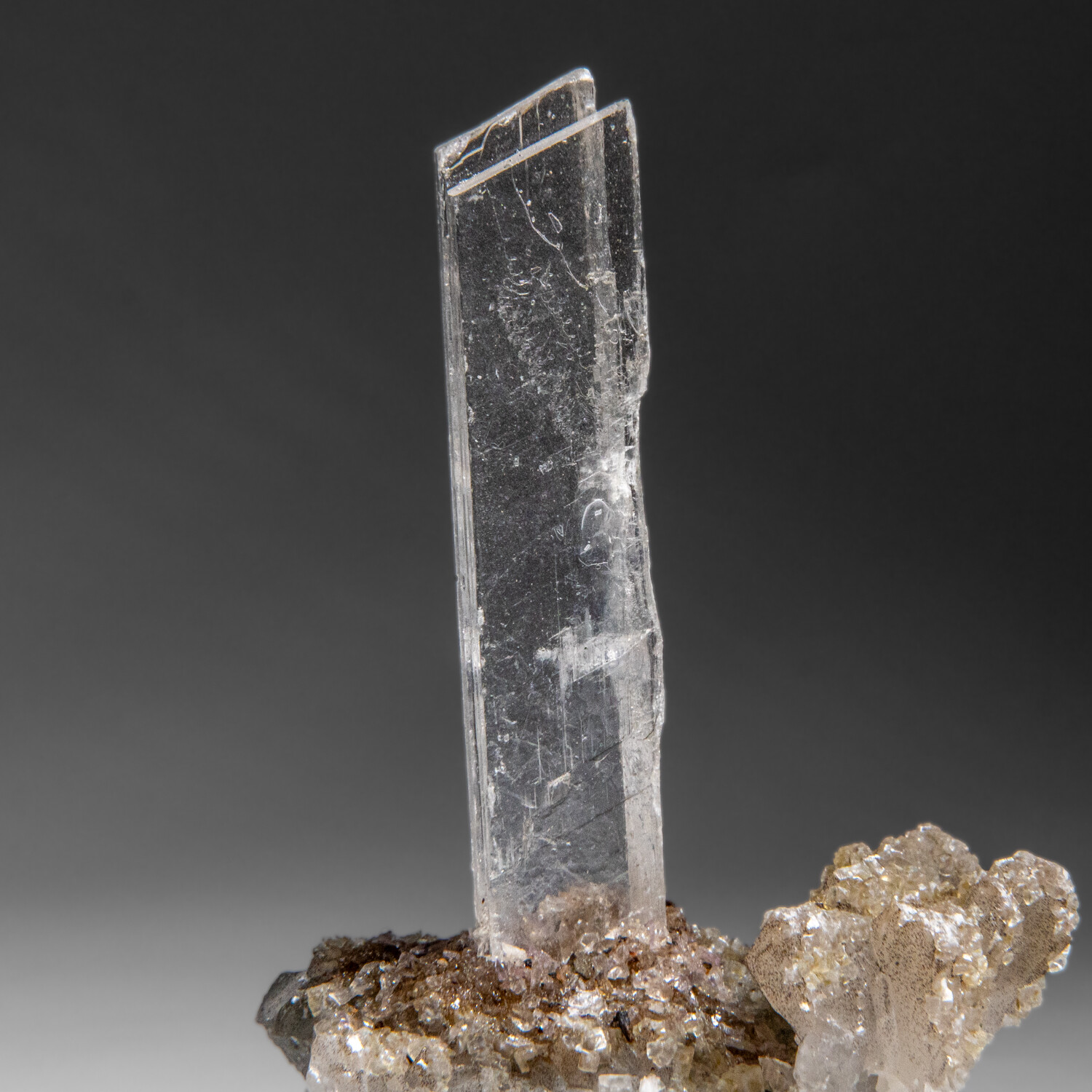 An aesthetic specimen of a 4" gem transparent gypsum var. selenite crystal on druzy matrix. The specimen has top quality transparency with a glassy luster and fully terminated crystal faces.