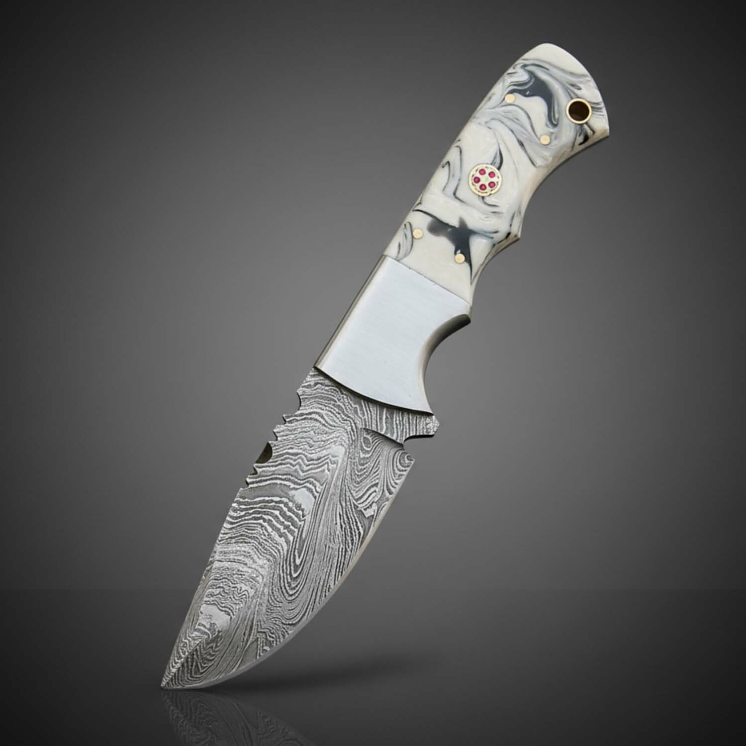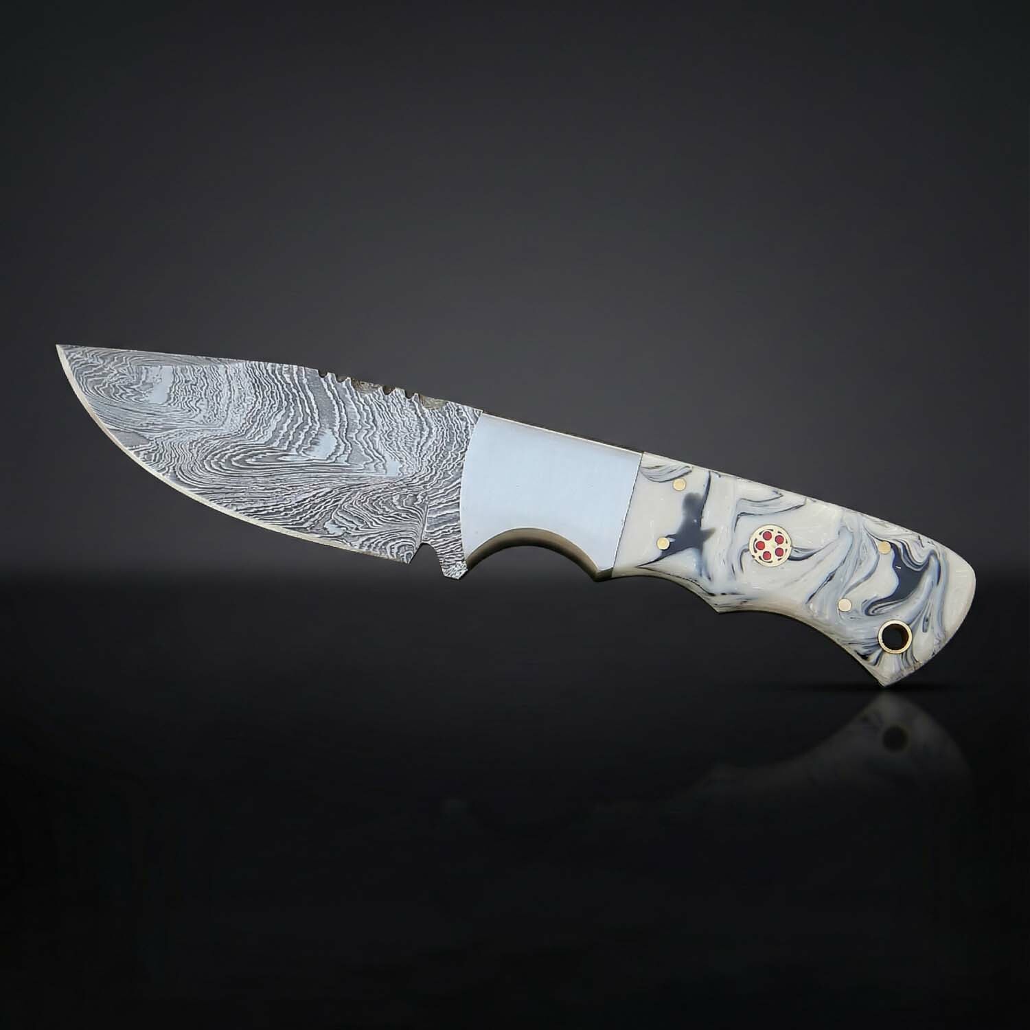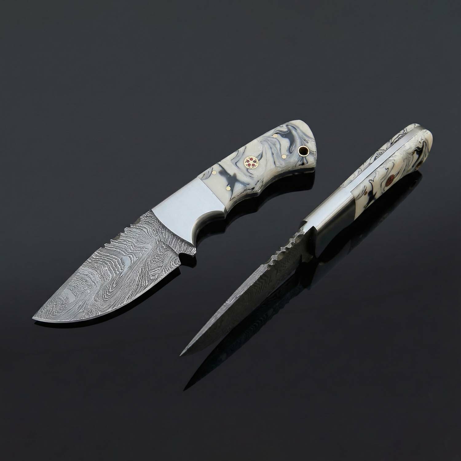 A compact, high-performance hunting knife featuring a finely patterned Damascus steel blade built for control and cutting power. The contoured marbled resin handle offers a secure, comfortable grip with a unique visual finish. It includes a hand-stitched leather sheath for safe carry and protection. A dependable tool for outdoorsmen who want both function and style.