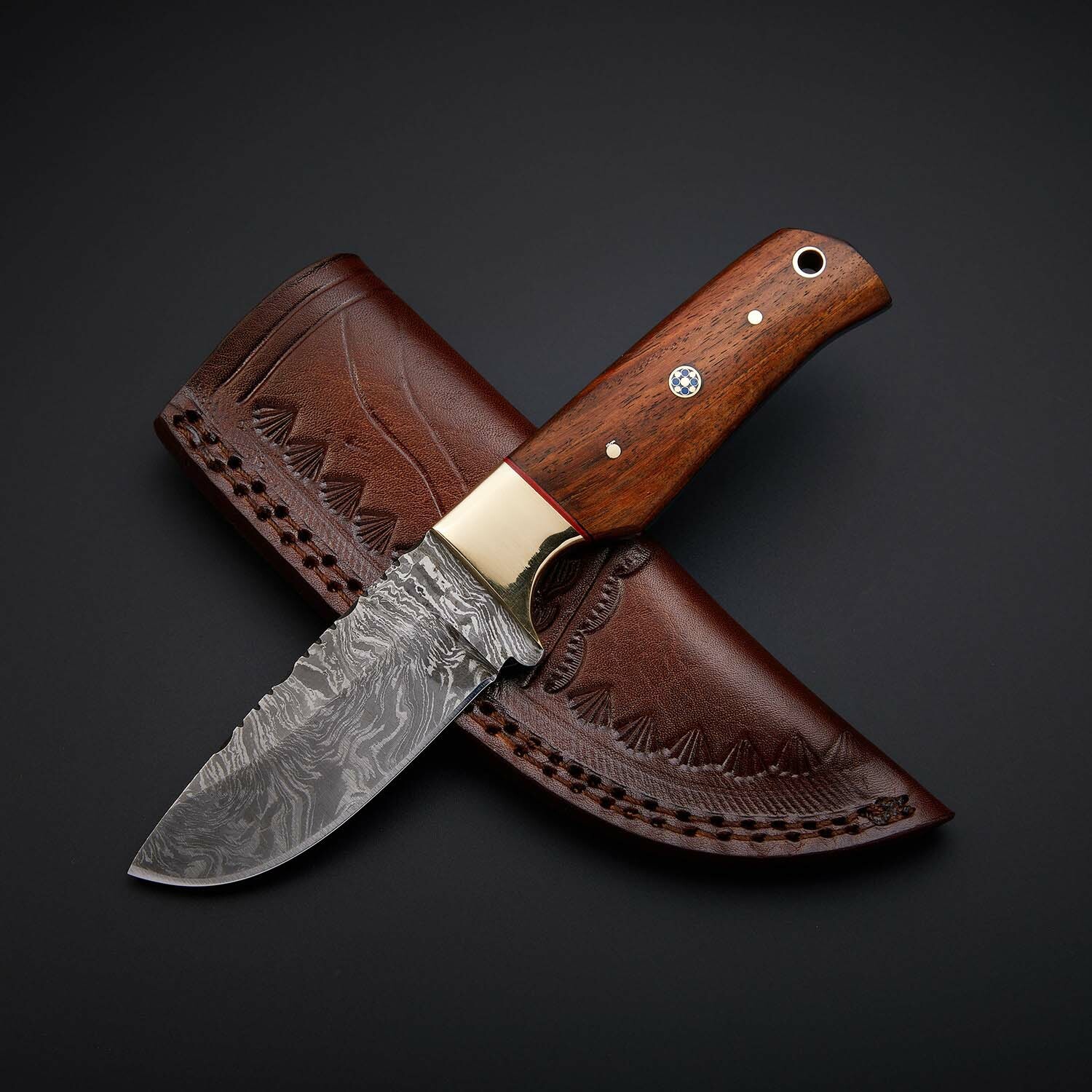 This handcrafted hunting knife features a full-pattern Damascus steel blade with a rugged cutting edge suited for outdoor use. The handle is made from polished rosewood and paired with a brass guard for strength and balance. A hand-stitched leather sheath is included for secure carry. A practical and refined tool for hunters, collectors, and outdoor enthusiasts.