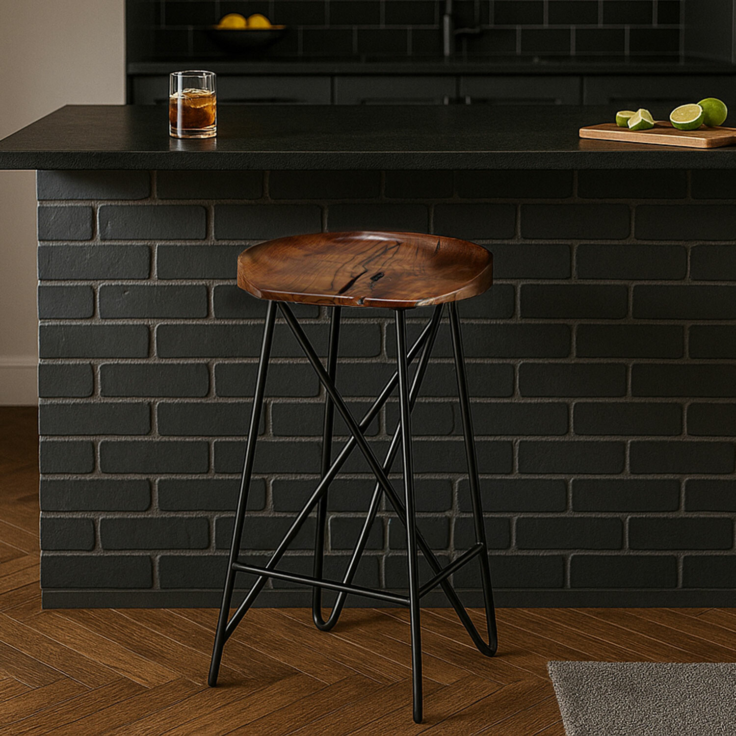 Bring a mix of rugged charm and natural beauty to your space with the industrial teak counter stool. Featuring a solid teak wood saddle seat with an oiled finish, each piece showcases unique grain patterns and organic variations. The black metal wire legs provide a sleek, sturdy base that pairs effortlessly with a range of counter or bar setups.