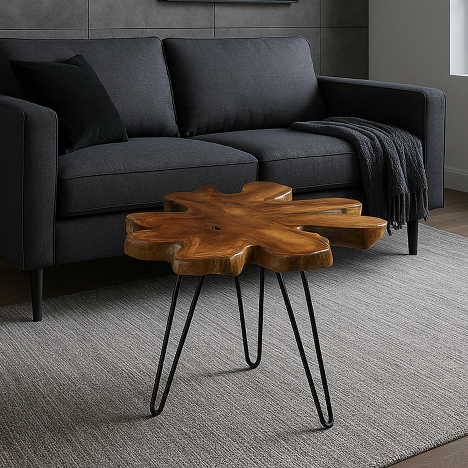 Bring organic character to your space with the Evan end table. This casual rustic piece features a naturally shaped teak wood top, showcasing the raw beauty and unique grain of the tree. Set on sturdy black metal hairpin legs, it blends rustic warmth with industrial edge—perfect as a side table in any modern or relaxed living space.