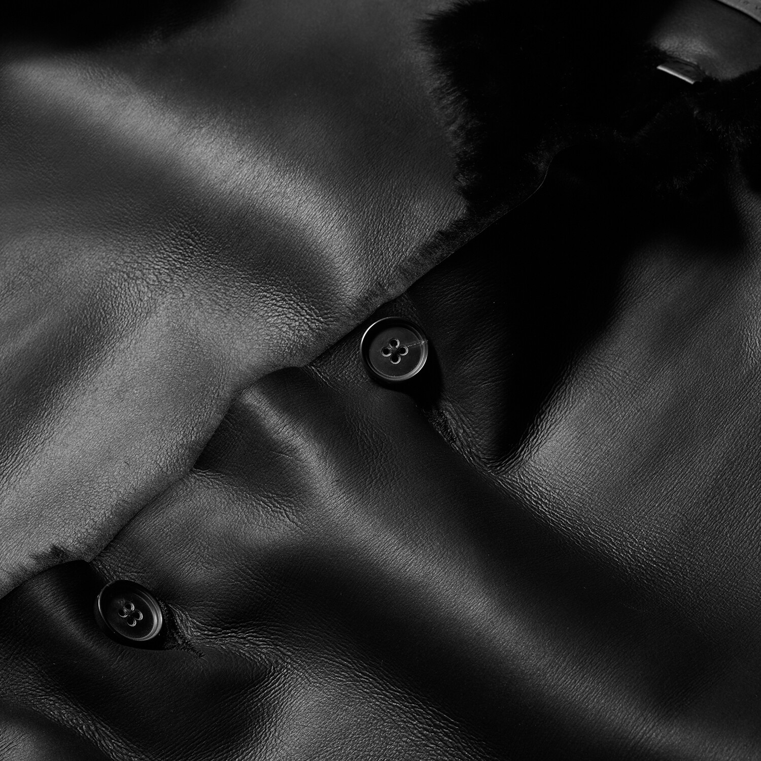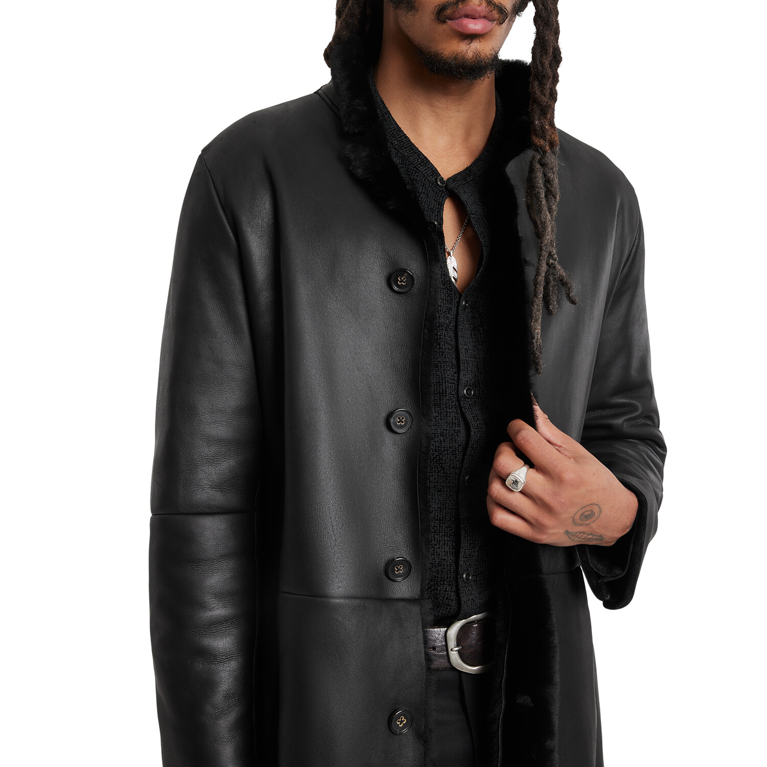 For the colder months, a shearling is a must. The Sicklen is a new style made from luxury sheepskin. It's longline silhouette showcases a clean finish, accented by shearling interior that is visible along the trims, offering warmth and style. Military-inspired large buttons, and practical slit hip pockets complete the look, adding functionality to this stylish design.