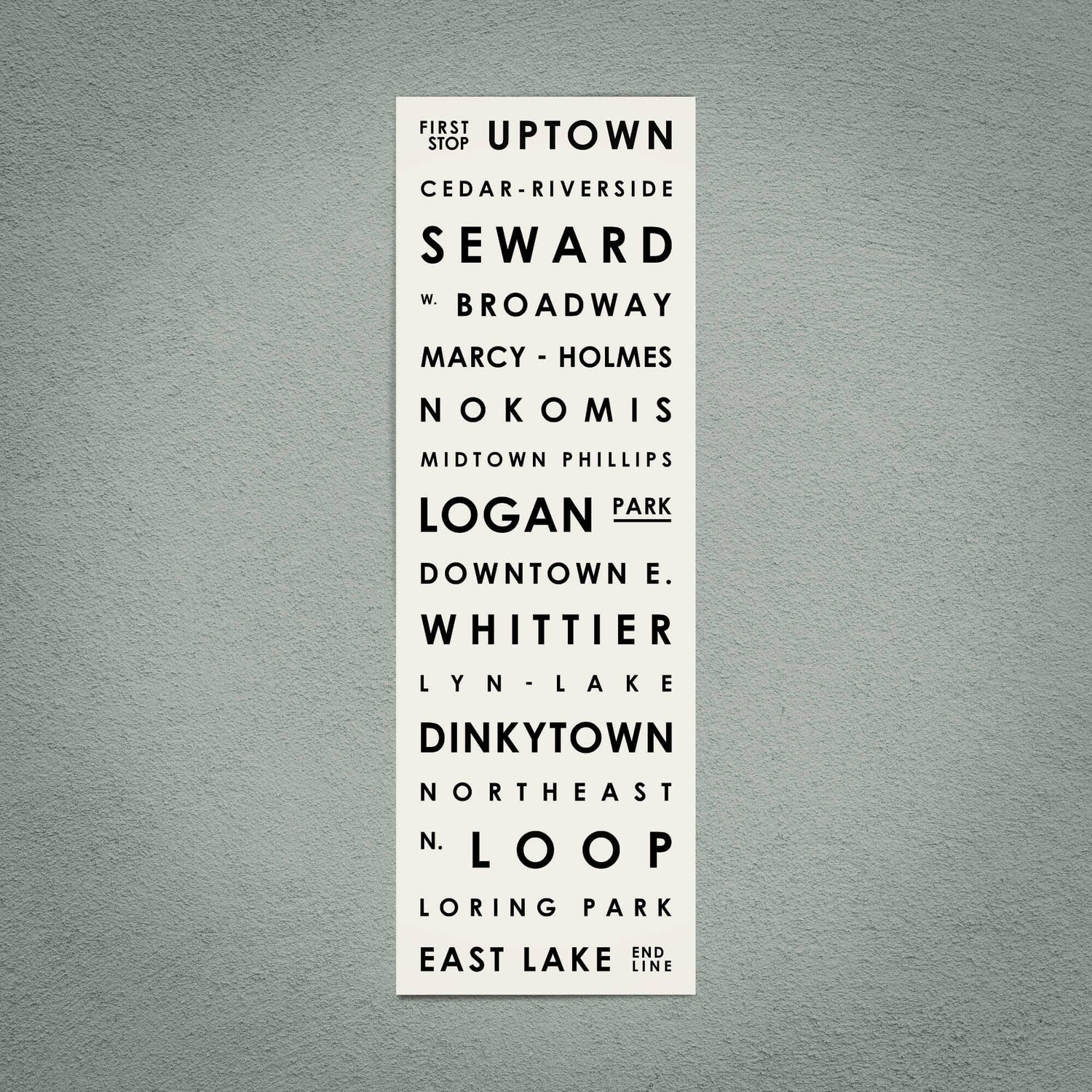 Celebrate your city with this modern typography art print featuring its unique neighborhoods. At 12" x 36", the long, vertical format makes a bold statement, perfect for brightening a hallway, or anchoring a gallery wall.