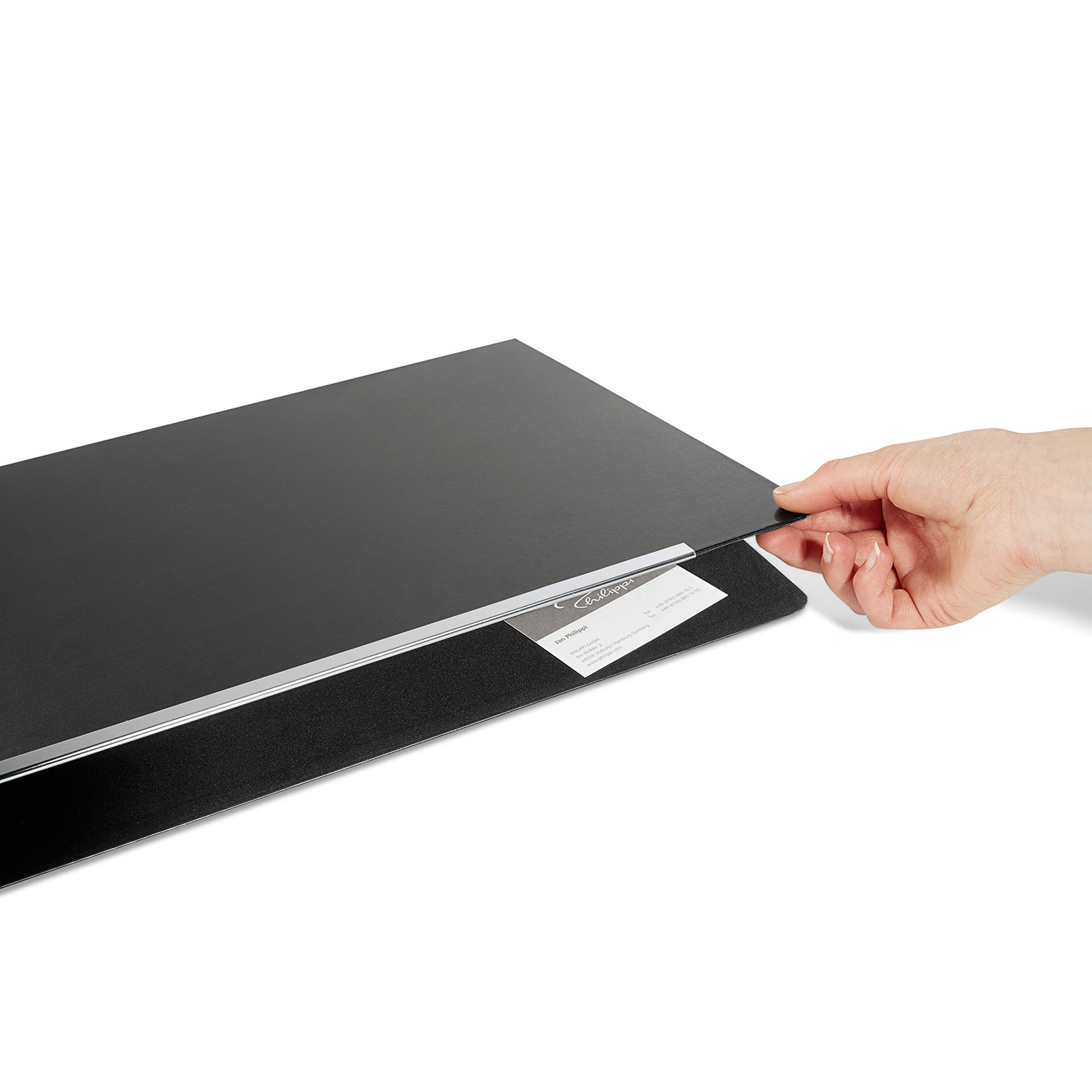 The space for this pretty straightforward, a simple desk pad in matte black, with a subtle silver edge that is not only reserved for bosses, chairmen or future presidents. CHRONICLE is a blessing for each and every strong-minded decision-maker’s working day and offers a discrete filing function for business cards, notes and other interesting secrets.
